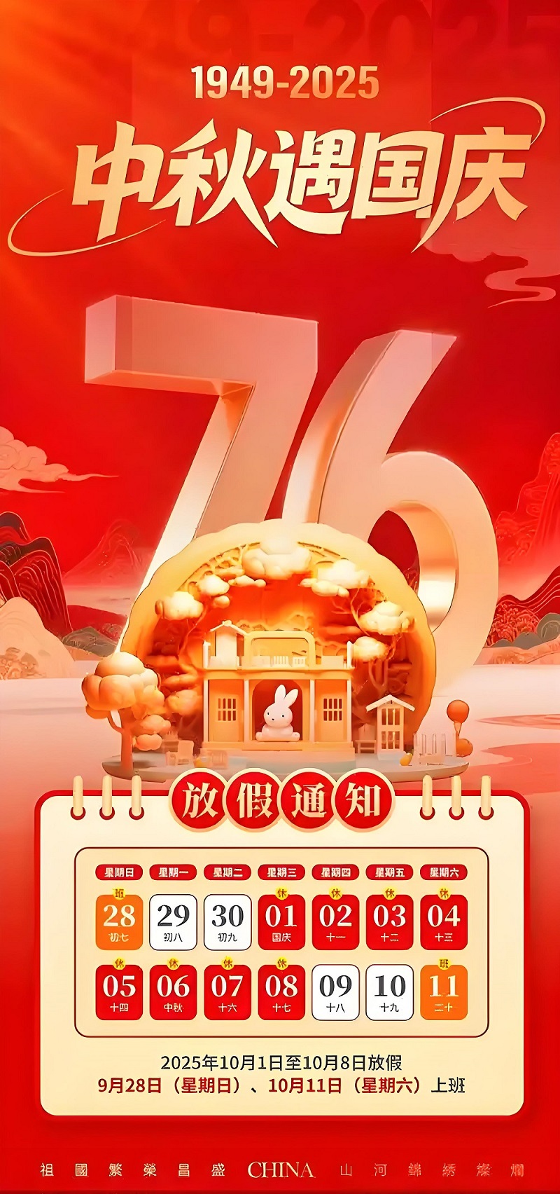 国庆节及中秋节放假时间为:10月1日至10月8日共8天;放假期间 不发货!